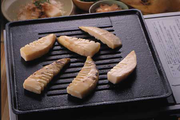 加热烧烤板,将竹笋排好,猛火烧至两面熟,将调料涂在竹笋上继续烤。烤至变色出锅后加木鱼花和山椒叶即可