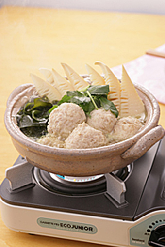 - 锅中放入B(调味料)煮开,加入竹笋,裙带菜,鸭儿芹,用勺子挖一勺丸子肉糜,放入锅中,煮3-4分钟,丸子浮起即可。